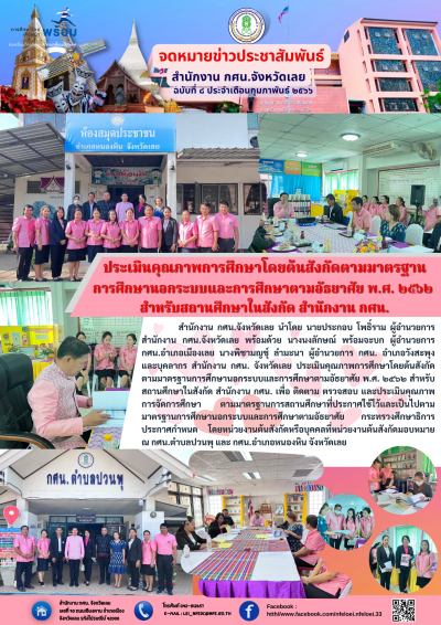 สำนักงาน กศน.จังหวัดเลย นำโดย นายประกอบ โพธิ์ราม ผู้อำนวยการสำนักงาน กศน.จังหวัดเลย พร้อมด้วย นางนงลักษณ์ พร้อมจะบก ผู้อำนวยการ กศน.อำเภอเมืองเลย นางพิชามญชุ์ ลำมะนา ผู้อำนวยการ กศน. อำเภอวังสะพุง และบุคลากร สำนักงาน กศน. จังหวัดเลย ประเมินคุณภาพการศึกษาโดยต้นสังกัดตามมาตรฐานการศึกษานอกระบบและการศึกษาตามอัธยาศัย พ.ศ. ๒๕๖๒ สำหรับสถานศึกษาในสังกัด สำนักงาน กศน. เพื่อ ติดตาม ตรวจสอบ และประเมินคุณภาพการจัดการศึกษา ตามมาตรฐานการสถานศึกษาที่ประกาศใช้ไว้และเป็นไปตามมาตรฐานการศึกษานอกระบบและการศึกษาตามอัธยาศัย กระทรวงศึกษาธิการประกาศกำหนด โดยหน่วยงานต้นสังกัดหรือบุคคลที่หน่วยงานต้นสังกัดมอบหมาย ณ กศน.ตำบลปวนพุ และ กศน.อำเภอหนองหิน จังหวัดเลย