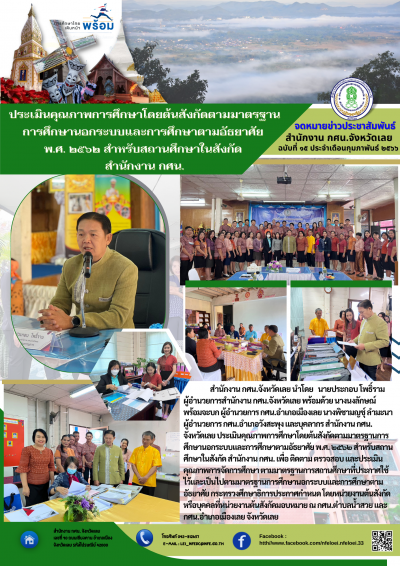 สำนักงาน กศน.จังหวัดเลย นำโดย นายประกอบ โพธิ์ราม ผู้อำนวยการสำนักงาน กศน.จังหวัดเลย พร้อมด้วย นางนงลักษณ์ พร้อมจะบก ผู้อำนวยการ กศน.อำเภอเมืองเลย นางพิชามญชุ์ ลำมะนา ผู้อำนวยการ กศน.อำเภอวังสะพุง และบุคลากร สำนักงาน กศน. จังหวัดเลย ประเมินคุณภาพการศึกษาโดยต้นสังกัดตามมาตรฐานการศึกษานอกระบบและการศึกษาตามอัธยาศัย พ.ศ. ๒๕๖๒ สำหรับสถานศึกษาในสังกัด สำนักงาน กศน. เพื่อ ติดตาม ตรวจสอบ และประเมินคุณภาพการจัดการศึกษา ตามมาตรฐานการสถานศึกษาที่ประกาศใช้ไว้และเป็นไปตามมาตรฐานการศึกษานอกระบบและการศึกษาตามอัธยาศัย กระทรวงศึกษาธิการประกาศกำหนด โดยหน่วยงานต้นสังกัดหรือบุคคลที่หน่วยงานต้นสังกัดมอบหมาย ณ กศน.ตำบลน้ำสวย และ กศน.อำเภอเมืองเลย จังหวัดเลย