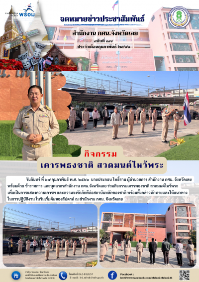 วันจันทร์ ที่ ๒๗ กุมภาพันธ์ พ.ศ. ๒๕๖๖ นายประกอบ โพธิ์ราม ผู้อำนวยการ สำนักงาน กศน. จังหวัดเลย พร้อมด้วย ข้าราชการ และบุคลากรสำนักงาน กศน.จังหวัดเลย ร่วมกิจกรรมเคารพธงชาติ สวดมนต์ไหว้พระ เพื่อเป็นการแสดงความเคารพ และความจงรักภักดีต่อสถาบันหลักของชาติ พร้อมทั้งกล่าวทักทายและให้แนวทางในการปฏิบัติงาน ในวันเริ่มต้นของสัปดาห์ ณ สำนักงาน กศน. จังหวัดเลย