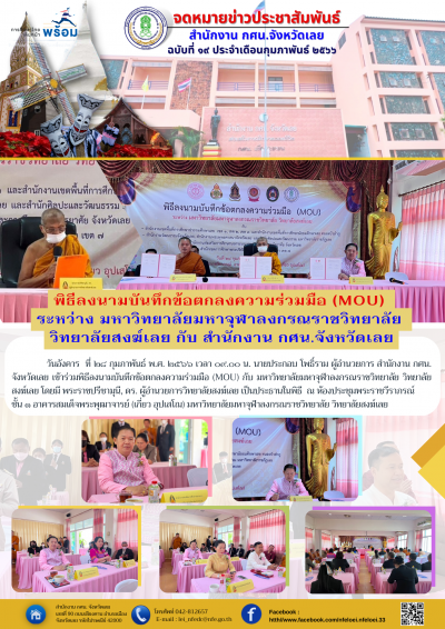 วันอังคาร ที่ ๒๘ กุมภาพันธ์ พ.ศ. ๒๕๖๖ เวลา ๐๙.๐๐ น. นายประกอบ โพธิ์ราม ผู้อำนวยการ สำนักงาน กศน. จังหวัดเลย เข้าร่วมพิธีลงนามบันทึกข้อตกลงความร่วมมือ (MOU) กับ มหาวิทยาลัยมหาจุฬาลงกรณราชวิทยาลัย วิทยาลัยสงฆ์เลย โดยมี พระราชปรีชามุนี, ดร. ผู้อำนวยการวิทยาลัยสงฆ์เลย เป็นประธานในพิธี ณ ห้องประชุมพระราชวีราภรณ์ ชั้น ๑ อาคารสมเด็จพระพุฒาจารย์ (เกี่ยว อุปเสโณ) มหาวิทยาลัยมหาจุฬาลงกรณราชวิทยาลัย วิทยาลัยสงฆ์เลย