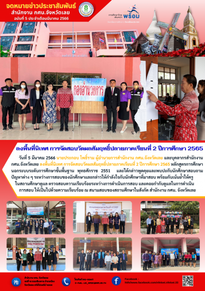 วันที่ 5 มีนาคม 2566 นายประกอบ โพธิ์ราม ผู้อำนวยการสำนักงาน กศน.จังหวัดเลย และบุคลากรสำนักงาน กศน.จังหวัดเลย ลงพื้นที่นิเทศ การจัดสอบวัดผลสัมฤทธิ์ปลายภาคเรียนที่ 2 ปีการศึกษา 2565 หลักสูตรการศึกษานอกระบบระดับการศึกษาขั้นพื้นฐาน พุทธศักราช 2551 และได้กล่าวพูดคุยและพบปะกับนักศึกษาสอบถามปัญหาต่าง ๆ ระหว่างการสอบของนักศึกษาและกล่าวให้กำลังใจกับนักศึกษาที่มาสอบ พร้อมกับเน้นย้ำให้ครูในสถานศึกษาดูแล ตรวจสอบความเรียบร้อยระหว่างการดำเนินการสอบ และคอยกำกับดูแลในการดำเนินการสอบ ให้เป็นไปด้วยความเรียบร้อย ณ สนามสอบของสถานศึกษาในสังกัด สำนักงาน กศน. จังหวัดเลย