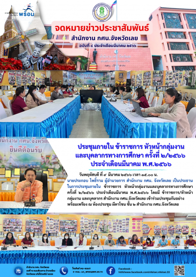 วันพฤหัสบดี ที่ ๙ มีนาคม ๒๕๖๖ เวลา ๑๕.๐๐ น. นายประกอบ โพธิ์ราม ผู้อำนวยการ สำนักงาน กศน. จังหวัดเลย เป็นประธานในการประชุมภายใน ข้าราชการ หัวหน้ากลุ่มงานและบุคลากรทางการศึกษา ครั้งที่ ๒/๒๕๖๖ ประจำเดือนมีนาคม พ.ศ.๒๕๖๖ โดยมี ข้าราชการ/หัวหน้ากลุ่มงาน และบุคลากร สำนักงาน กศน.จังหวัดเลย เข้าร่วมประชุมกันอย่าง พร้อมเพรียง ณ ห้องประชุม ผีตาโขน ชั้น ๒ สำนักงาน กศน.จังหวัดเลย