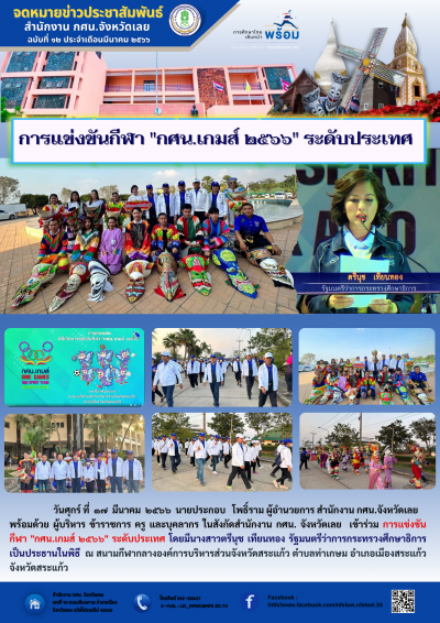 วันศุกร์ ที่ ๑๗ มีนาคม ๒๕๖๖ นายประกอบ โพธิ์ราม ผู้อำนวยการ สำนักงาน กศน.จังหวัดเลย พร้อมด้วย ผู้บริหาร ข้าราชการ ครู และบุคลากร ในสังกัดสำนักงาน กศน. จังหวัดเลย เข้าร่วม การแข่งขันกีฬา "กศน.เกมส์ ๒๕๖๖" ระดับประเทศ โดยมีนางสาวตรีนุช เทียนทอง รัฐมนตรีว่าการกระทรวงศึกษาธิการ เป็นประธานในพิธี ณ สนามกีฬากลางองค์การบริหารส่วนจังหวัดสระแก้ว ตำบลท่าเกษม อำเภอเมืองสระแก้ว จังหวัดสระแก้ว