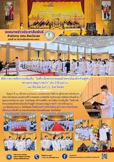 วันศุกร์ ที่ ๓๑ มีนาคม พ.ศ.๒๕๖๖ นายประกอบ โพธิ์ราม ผู้อำนวยการสำนักงาน กศน.จังหวัดเลย มอบหมายให้ นายสมพร มาตย์สุริย์ ครูชำนาญการพิเศษ พร้อมด้วย บุคลากรสำนักงาน กศน. จังหวัดเลย เข้าร่วมพิธีถวายราชสักการะเนื่องใน "วันที่ระลึกพระบาทสมเด็จพระนั่งเกล้าเจ้าอยู่หัว พระมหาเจษฎาราชเจ้า" ประจำปี ๒๕๖๖ ๓๑ มีนาคม ๒๕๖๖ จังหวัดเลย โดยมีนายทวี เสริมภักดีกุล ผู้ว่าราชการจังหวัดเลย เป็นประธานในพิธี ณ ศาลาประชาคม อำเภอเมืองเลย จังหวัดเลย