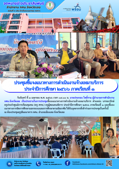 วันจันทร์ ที่ ๓ เมษายน พ.ศ. ๒๕๖๖ เวลา ๐๙.๐๐ น. นายประกอบ โพธิ์ราม ผู้อำนวยการสำนักงาน กศน.จังหวัดเลย เป็นประธานในการประชุมชี้แจงแนวทางการดำเนินงานจ้างเหมาบริการ ตำแหน่ง บรรณารักษ์ ครูประจำศูนย์การเรียนชุมชน (ครู ศรช.) ครูผู้สอนคนพิการ ประจำปีการศึกษา ๒๕๖๖ ภาคเรียนที่ ๑ และชี้แจงแนวทางการจัดการศึกษานอกระบบและการศึกษาตามอัธยาศัย ให้กับบุคลากรที่เข้าร่วมการประชุมในครั้งนี้ ณ ห้องประชุมคุรุสัมมนาคาร กศน. อำเภอเมืองเลย จังหวัดเลย