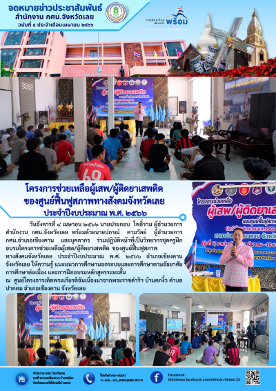 วันอังคารที่ ๔ เมษายน ๒๕๖๖ นายประกอบ โพธิ์ราม ผู้อำนวยการ สำนักงาน กศน.จังหวัดเลย พร้อมด้วยนายปกรณ์ คามวัลย์ ผู้อำนวยการ กศน.อำเภอเชียงคาน และบุคลากร ร่วมปฏิบัติหน้าที่เป็นวิทยากรชุดครูฝึกอบรมโครงการช่วยเหลือผู้เสพ/ผู้ติดยาเสพติด ของศูนย์ฟื้นฟูสภาพทางสังคมจังหวัดเลย ประจำปีงบประมาณ พ.ศ. ๒๕๖๖ อำเภอเชียงคาน จังหวัดเลย ให้ความรู้ แนะแนวการศึกษานอกระบบและการศึกษาตามอัธยาศัย การศึกษาต่อเนื่อง และการฝึกอบรมหลักสูตรระยะสั้น ณ ศูนย์โครงการเทิดพระเกียรติอันเนื่องมาจากพระราชดำริฯ บ้านคกงิ้ว ตำบลปากตม อำเภอเชียงคาน จังหวัดเลย