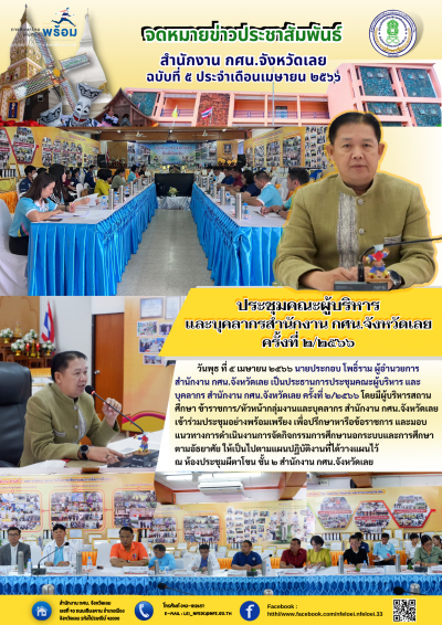 วันพุธ ที่ ๕ เมษายน ๒๕๖๖ นายประกอบ โพธิ์ราม ผู้อำนวยการ สำนักงาน กศน.จังหวัดเลย เป็นประธานการประชุมคณะผู้บริหาร และบุคลากร สำนักงาน กศน.จังหวัดเลย ครั้งที่ ๒/๒๕๖๖ โดยมีผู้บริหารสถานศึกษา ข้าราชการ/หัวหน้ากลุ่มงานและบุคลากร สำนักงาน กศน.จังหวัดเลย เข้าร่วมประชุมอย่างพร้อมเพรียง เพื่อปรึกษาหารือข้อราชการ และมอบแนวทางการดำเนินงานการจัดกิจกรรมการศึกษานอกระบบและการศึกษาตามอัธยาศัย ให้เป็นไปตามแผนปฏิบัติงานที่ได้วางแผนไว้ ณ ห้องประชุมผีตาโขน ชั้น ๒ สำนักงาน กศน.จังหวัดเลย