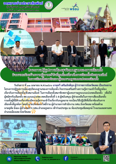 วันอังคาร ที่ ๑๑ เมษายน พ.ศ.๒๕๖๖ นายทวี เสริมภักดีกุล ผู้ว่าราชการจังหวัดเลย เป็นประธานโครงการปฏิรูปการเมืองสุจริตบนฐานของการเลือกตั้ง กิจกรรมเสริมสร้างความรู้ความเข้าใจที่ถูกต้อง เกี่ยวกับการเลือกตั้งเชิงสมานฉันท์ ในการเลือกตั้งสมาชิกสภาผู้แทนราษฎรแบบแบ่งเขตเลือกตั้ง เพื่อให้ผู้สมัครรับเลือกตั้ง สส.แบบแบ่งเขต เขตเลือกตั้งที่ 1-4 ผู้สนับสนุน ผู้ช่วยเหลือในการหาเสียงเลือกตั้ง รวมทั้งผู้ที่มีส่วนเกี่ยวข้องมีความรู้ความเข้าใจเกี่ยวกับกฎหมาย ระเบียบวิธีปฏิบัติที่เกี่ยวข้องกับการ เลือกตั้งที่ถูกต้อง โดยมี นายประกอบ โพธิ์ราม ผู้อำนวยการสำนักงาน กศน.จังหวัดเลย พร้อมด้วย นายอุทัย ยิ่งยง ผู้อำนวยการ กศน.อำเภอภูหลวง เข้าร่วมประชุม ณ ห้องประชุมชัยพฤกษ์ โรงแรมเลยพาเลซ อำเภอเมืองเลย จังหวัดเลย