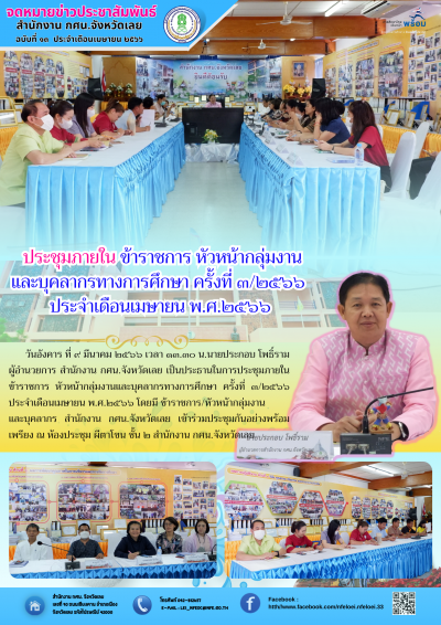 วันอังคาร ที่ ๙ มีนาคม ๒๕๖๖ เวลา ๑๓.๓๐ น.นายประกอบ โพธิ์ราม ผู้อำนวยการ สำนักงาน กศน.จังหวัดเลย เป็นประธานในการประชุมภายใน ข้าราชการ หัวหน้ากลุ่มงานและบุคลากรทางการศึกษา ครั้งที่ ๓/๒๕๖๖ ประจำเดือนเมษายน พ.ศ.๒๕๖๖ โดยมี ข้าราชการ/หัวหน้ากลุ่มงานและบุคลากร สำนักงาน กศน.จังหวัดเลย เข้าร่วมประชุมกันอย่างพร้อมเพรียง ณ ห้องประชุม ผีตาโขน ชั้น ๒ สำนักงาน กศน.จังหวัดเลย