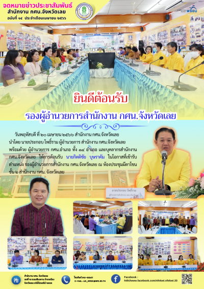 วันพฤหัสบดี ที่ ๒๐ เมษายน ๒๕๖๖ สำนักงาน กศน.จังหวัดเลย นำโดย นายประกอบ โพธิ์ราม ผู้อำนวยการ สำนักงาน กศน.จังหวัดเลย พร้อมด้วย ผู้อำนวยการ กศน.อำเภอ ทั้ง ๑๔ อำเภอ และบุคลากรสำนักงาน กศน.จังหวัดเลย ให้การต้อนรับ นายกิตติชัย บุษราคัม ในโอกาสที่เข้ารับตำแหน่ง รองผู้อำนวยการสำนักงาน กศน.จังหวัดเลย ณ ห้องประชุมผีตาโขน ชั้น ๒ สำนักงาน กศน. จังหวัดเลย