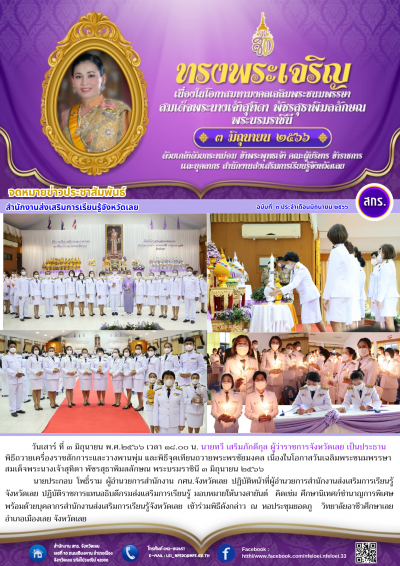 วันเสาร์ ที่ ๓ มิถุนายน พ.ศ.๒๕๖๖ เวลา ๑๘.๐๐ น. นายทวี เสริมภักดีกุล ผู้ว่าราชการจังหวัดเลย เป็นประธานพิธีถวายเครื่องราชสักการะและวางพานพุ่ม และพิธีจุดเทียนถวายพระพรชัยมงคล เนื่องในโอกาสวันเฉลิมพระชนมพรรษาสมเด็จพระนางเจ้าสุทิดา พัชรสุธาพิมลลักษณ พระบรมราชินี ๓ มิถุนายน ๒๕๖๖