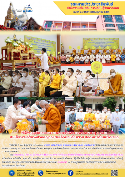 วันจันทร์ ที่ ๒๖ มิถุนายน พ.ศ.๒๕๖๖ เวลา ๐๗.๐๐ น. นายทวี เสริมภักดีกุล ผู้ว่าราชการจังหวัดเลย เป็นประธานพิธีทำบุญตักบาตรถวายพระกุศลฉลองพระชนมายุ ๘ รอบ สมเด็จพระอริยวงศาคตญาณ สมเด็จพระสังฆราช สกลมหาสังฆปริณายก เนื่องในโอกาสทรงเจริญพระชนมายุ ๘ รอบ ๙๖ พรรษา
