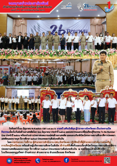 วันจันทร์ ที่ ๒๖ มิถุนายน พ.ศ.๒๕๖๖ เวลา ๐๙.๓๐ น. นายทวี เสริมภักดีกุล ผู้ว่าราชการจังหวัดเลย เป็นประธานเปิดกิจกรรมเนื่องในวันต่อต้านยาเสพติดโลก (๒๖ มิถุนายน) ประจำปี ๒๕๖๖ และมหกรรมแลกเปลี่ยนเรียนรู้กิจกรรม To Be Number One ประจำปี ๒๕๖๖ พร้อมนำกล่าวประกาศเจตนารมณ์ต่อต้านยาเสพติด และมอบเกียรติบัตรโครงการสถานศึกษาสีขาวปลอดยาเสพติดและอบายมุข ปีการศึกษา ๒๕๖๕ ประเภทผลงานดีเด่นระดับเงิน