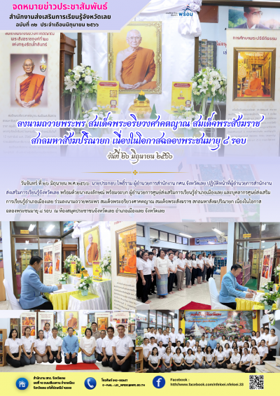 วันจันทร์ ที่ ๒๖ มิถุนายน พ.ศ.๒๕๖๖ นายประกอบ โพธิ์ราม ผู้อำนวยการสำนักงาน กศน.จังหวัดเลย ปฏิบัติหน้าที่ผู้อำนวยการสำนักงานส่งเสริมการเรียนรู้จังหวัดเลย พร้อมด้วยนางนงลักษณ์ พร้อมจะบก ผู้อำนวยการศูนย์ส่งเสริมการเรียนรู้อำเภอเมืองเลย และบุคลากรศูนย์ส่งเสริมการเรียนรู้อำเภอเมืองเลย ร่วมลงนามถวายพระพร สมเด็จพระอริยวงศาคตญาณ สมเด็จพระสังฆราช สกลมหาสังฆปริณายก เนื่องในโอกาส ฉลองพระชนมายุ ๘ รอบ ณ ห้องสมุดประชาชนจังหวัดเลย อำเภอเมืองเลย จังหวัดเลย