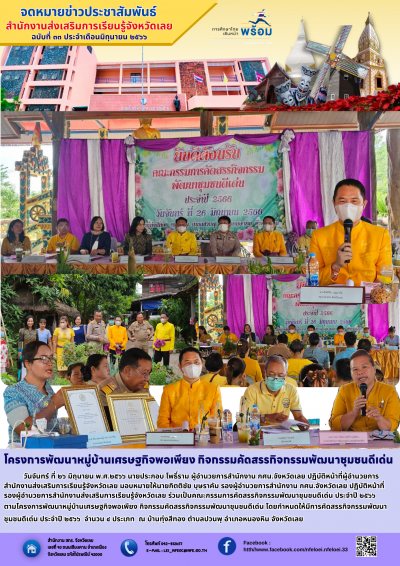 ร่วมเป็นคณะกรรมการคัดสรรกิจกรรมพัฒนาชุมชนดีเด่น ประจำปี 2566 ตามโครงการพัฒนาหมู่บ้านเศรษฐกิจพอเพียง กิจกรรมคัดสรรกิจกรรมพัฒนาชุมชนดีเด่น โดยกำหนดให้มีการคัดสรรกิจกรรมพัฒนาชุมชนดีเด่น ประจำปี ๒๕๖๖ จำนวน ๔ ประเภท ณ บ้านทุ่งสีทอง ตำบลปวนพุ อำเภอหนองหิน จังหวัดเลย