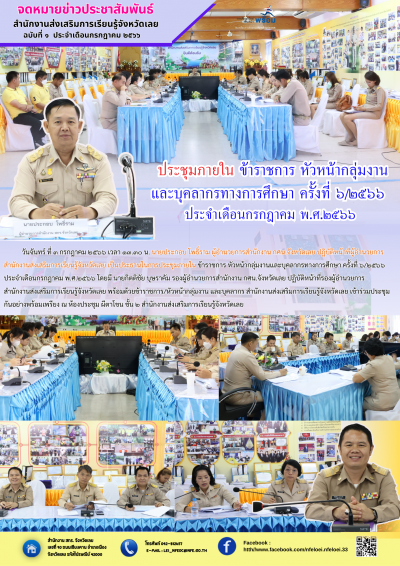 วันจันทร์ ที่ ๓ กรกฎาคม ๒๕๖๖ เวลา ๑๓.๓๐ น. นายประกอบ โพธิ์ราม ผู้อำนวยการสำนักงาน กศน.จังหวัดเลย ปฏิบัติหน้าที่ผู้อำนวยการสำนักงานส่งเสริมการเรียนรู้จังหวัดเลย เป็นประธานในการประชุมภายใน ข้าราชการ หัวหน้ากลุ่มงานและบุคลากรทางการศึกษา ครั้งที่ ๖/๒๕๖๖ ประจำเดือนกรกฎาคม พ.ศ.๒๕๖๖ โดยมี นายกิตติชัย บุษราคัม รองผู้อำนวยการสำนักงาน กศน.จังหวัดเลย ปฏิบัติหน้าที่รองผู้อำนวยการ สำนักงานส่งเสริมการเรียนรู้จังหวัดเลย พร้อมด้วยข้าราชการ/หัวหน้ากลุ่มงาน และบุคลากร สำนักงานส่งเสริมการเรียนรู้จังหวัดเลย เข้าร่วมประชุมกันอย่างพร้อมเพรียง ณ ห้องประชุม ผีตาโขน ชั้น ๒ สำนักงานส่งเสริมการเรียนรู้จังหวัดเลย