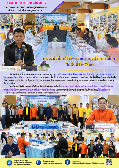 วันพฤหัสบดี ที่ ๖ กรกฎาคม ๒๕๖๖ เวลา ๑๓.๓๐ น. ว่าที่ร้อยเอกวิสาร ปัญญชุณห์ รองศึกษาธิการ ภาค ๑๐ รักษาการในตำแหน่ง ศึกษาธิการ ภาค ๑๐ เป็นประธานการลงพื้นที่กำกับติดตามสภาวการณ์ทางการศึกษา ในพื้นที่จังหวัดเลย เพื่อรับฟัง/รับทราบผลการดำเนินงาน ปัญหา/อุปสรรค ตลอดจนข้อเสนอแนะ แนวทางแก้ไขปัญหา และสภาวการณ์ทางการศึกษาต่าง ๆที่อาจเกิดขึ้น