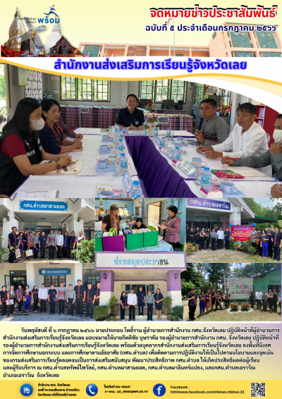 วันพฤหัสบดี ที่ ๖ กรกฎาคม ๒๕๖๖ นายประกอบ โพธิ์ราม ผู้อำนวยการสำนักงาน กศน.จังหวัดเลย ปฏิบัติหน้าที่ผู้อำนวยการสำนักงานส่งเสริมการเรียนรู้จังหวัดเลย มอบหมายให้นายกิตติชัย บุษราคัม รองผู้อำนวยการสำนักงาน กศน. จังหวัดเลย ปฏิบัติหน้าที่รองผู้อำนวยการสำนักงานส่งเสริมการเรียนรู้จังหวัดเลย พร้อมด้วยบุคลากรสำนักงานส่งเสริมการเรียนรู้จังหวัดเลย ลงพื้นที่นิเทศการจัดการศึกษานอกระบบ และการศึกษาตามอัธยาศัย (กศน.ตำบล) เพื่อติดตามการปฏิบัติงานให้เป็นไปตามนโยบายและจุดเน้นของกรมส่งเสริมการเรียนรู้ตลอดจนเป็นการส่งเสริมสนับสนุน พัฒนาประสิทธิภาพ กศน.ตำบล ให้เกิดประสิทธิผลต่อผู้เรียนและผู้รับบริการ ณ กศน.ตำบลทรัพย์ไพวัลย์, กศน.ตำบลผาสามยอด, กศน.ตำบลผาอินทร์แปลง, และกศน.ตำบลเอราวัณอำเภอเอราวัณ จังหวัดเลย
