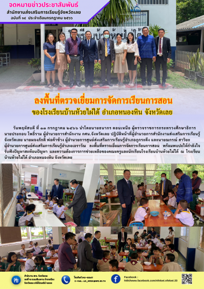 วันพฤหัสบดี ที่ ๑๓ กรกฎาคม ๒๕๖๖ นำโดยนายธนากร ดอนเหนือ ผู้ตรวจราชการกระทรวงศึกษาธิการ นายประกอบ โพธิ์ราม ผู้อำนวยการสำนักงาน กศน.จังหวัดเลย ปฏิบัติหน้าที่ผู้อำนวยการสำนักงานส่งเสริมการเรียนรู้จังหวัดเลย นายผจงภักดิ์ พ่อค้าช้าง ผู้อำนวยการศูนย์ส่งเสริมการเรียนรู้อำเภอภูกระดึง และนายณกรณ์ สาวิยะ ผู้อำนวยการศูนย์ส่งเสริมการเรียนรู้อำเภอเอราวัณ ลงพื้นที่ตรวจเยี่ยมการจัดการเรียนการสอน พร้อมพบปะให้กำลังใจ รับฟังปัญหาสะท้อนปัญหา และความต้องการการช่วยเหลือของคณะครูและนักเรียนโรงเรียนบ้านห้วยไผ่ใต้ ณ โรงเรียนบ้านห้วยไผ่ใต้ อำเภอหนองหิน จังหวัดเลย