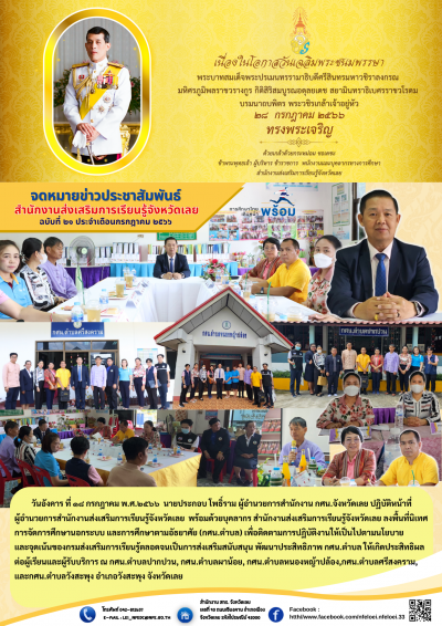 วันอังคาร ที่ ๑๘ กรกฎาคม พ.ศ.๒๕๖๖ นายประกอบ โพธิ์ราม ผู้อำนวยการสำนักงาน กศน.จังหวัดเลย ปฏิบัติหน้าที่ผู้อำนวยการสำนักงานส่งเสริมการเรียนรู้จังหวัดเลย พร้อมด้วยบุคลากร สำนักงานส่งเสริมการเรียนรู้จังหวัดเลย ลงพื้นที่นิเทศการจัดการศึกษานอกระบบ และการศึกษาตามอัธยาศัย (กศน.ตำบล) เพื่อติดตามการปฏิบัติงานให้เป็นไปตามนโยบายและจุดเน้นของกรมส่งเสริมการเรียนรู้ตลอดจนเป็นการส่งเสริมสนับสนุน พัฒนาประสิทธิภาพ กศน.ตำบล ให้เกิดประสิทธิผลต่อผู้เรียนและผู้รับบริการ ณ กศน.ตำบลปากปวน, กศน.ตำบลผาน้อย, กศน.ตำบลหนองหญ้าปล้อง,กศน.ตำบลศรีสงคราม,และกศน.ตำบลวังสะพุง อำเภอวังสะพุง จังหวัดเลย