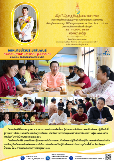โดยมีนายกิตติชัย บุษราคัม รองผู้อำนวยการสำนักงาน กศน. จังหวัดเลย ปฏิบัติหน้าที่รองผู้อำนวยการสำนักงานส่งเสริมการเรียนรู้จังหวัดเลย พร้อมด้วยบุคลากรสำนักงานส่งเสริมการเรียนรู้จังหวัดเลยเข้าร่วมประชุมในครั้งนี้ ณ ห้องประชุมน้ำหมาน ชั้น ๑ สำนักงานส่งเสริมการเรียนรู้จังหวัดเลย