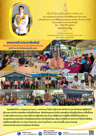 วันพฤหัสบดี ที่ ๒๐ กรกฎาคม พ.ศ.๒๕๖๖ นายประกอบ โพธิ์ราม ผู้อำนวยการสำนักงาน กศน.จังหวัดเลย ปฏิบัติหน้าที่ผู้อำนวยการสำนักงานส่งเสริมการเรียนรู้จังหวัดเลย พร้อมด้วยบุคลากร สำนักงานส่งเสริมการเรียนรู้จังหวัดเลย ลงพื้นที่นิเทศการจัดการศึกษานอกระบบ และการศึกษาตามอัธยาศัย (กศน.ตำบล) เพื่อติดตามการปฏิบัติงานให้เป็นไปตามนโยบายและจุดเน้นของกรมส่งเสริมการเรียนรู้ตลอดจนเป็นการส่งเสริมสนับสนุน พัฒนาประสิทธิภาพ กศน.ตำบล ให้เกิดประสิทธิผลต่อผู้เรียนและผู้รับบริการ ณ กศน.ตำบลกกทอง, กศน.ตำบลน้ำหมาน, กศน.ตำบลเสี้ยว,กศน.ตำบลกกดู่และกศน.ตำบลนาแขม อำเภอเมืองเลย จังหวัดเลย
