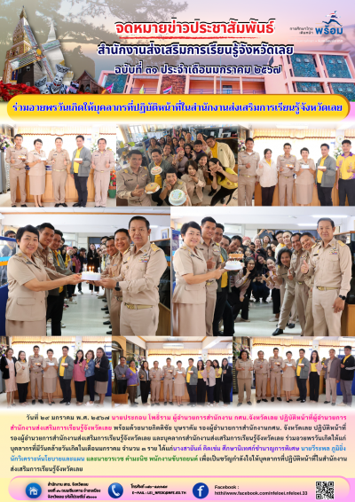 วันที่ ๒๙ มกราคม พ.ศ. ๒๕๖๗ นายประกอบ โพธิ์ราม ผู้อำนวยการสำนักงาน กศน.จังหวัดเลย ปฏิบัติหน้าที่ผู้อำนวยการสำนักงานส่งเสริมการเรียนรู้จังหวัดเลย พร้อมด้วยนายกิตติชัย บุษราคัม รองผู้อำนวยการสำนักงานกศน. จังหวัดเลย ปฏิบัติหน้าที่รองผู้อำนวยการสำนักงานส่งเสริมการเรียนรู้จังหวัดเลย และบุคลากรสำนักงานส่งเสริมการเรียนรู้จังหวัดเลย ร่วมอวยพรวันเกิดให้แก่บุคลากรที่มีวันคล้ายวันเกิดในเดือนมกราคม จำนวน ๓ ราย ได้แก่นางสายันต์ คิดเข่ม ศึกษานิเทศก์ชำนาญการพิเศษ นายวีระพล ภูมิยิ่ง นักวิเคราะห์นโยบายและแผน และนายวรเวช คำมะนิช พนักงานขับรถยนต์ เพื่อเป็นขวัญกำลังใจให้บุคลากรที่ปฏิบัติหน้าที่ในสำนักงานส่งเสริมการเรียนรู้จังหวัดเลย