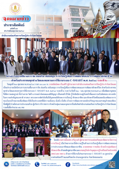 วันพุธที่ ๒๑ ตุลาคม พ.ศ.๒๕๖๘ เวลา ๑๐.๓๐ น. นายทัศน์พล เรืองศิริ ผู้อำนวยการสำนักงานส่งเสริมการเรียนรู้ประจำจังหวัดเลย เป็นประธานเปิดโครงการอบรมชี้แจงการจัด ส่งเสริม สนับสนุน การเรียนรู้เพื่อการพัฒนาตนเองการพัฒนาทักษะชีวิต สำหรับประชาชนทุกช่วงวัยและทบทวนการใช้งานระบบ C-SMART พ.ศ. ๒๕๖๘ ระยะที่ ๒ ระหว่างวันที่ ๒๑ - ๒๒ ตุลาคม พ.ศ.๒๕๖๘ เพื่อพัฒนาบุคคลให้มีความสมบูรณ์ ทั้งร่างกาย จิตใจ อารมณ์ สังคมและสติปัญญา เป็นคนดี มีวินัย รู้จักสิทธิควบคู่กับหน้าที่และความรับผิดชอบ ตระหนักในความสำคัญของชาติ ศาสนา พระมหากษัตริย์เพื่อให้บุคคลมีทักษะการเรียนรู้ ทักษะอาชีพ และทักษะชีวิตที่สอดคล้องพัฒนาการของโลกเป้าหมายเพื่อพัฒนาให้เป็นประเทศที่มีความมั่นคง มั่งคั่ง ยั่งยืน ด้วยการพัฒนาตามหลักปรัชญาของเศรษฐกิจพอเพียง ซึ่งมีผู้เข้าร่วมโครงการประกอบด้วย ผู้บริหาร ข้าราชการ หัวหน้ากลุ่มงานและบุคลากรในสังกัดสำนักงานส่งเสริมการเรียนรู้ประจำจังหวัดเลย รวมทั้งสิ้นจำนวน ๗๘ คน