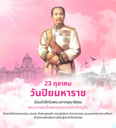 ๒๓ ตุลาคม วันปิยมหาราช น้อมรำลึกในพระมหากรุณาธิคุณ พระบาทสมเด็จพระจุลจอมเกล้าเจ้าอยู่หัว ---------- ด้วยเกล้าด้วยกระหม่อม ขอเดชะ ข้าพระพุทธเจ้า คณะผู้บริหาร ข้าราชการครู และบุคลากรทางการศึกษา สำนักงานส่งเสริมการเรียนรู้ประจำจังหวัดเลย