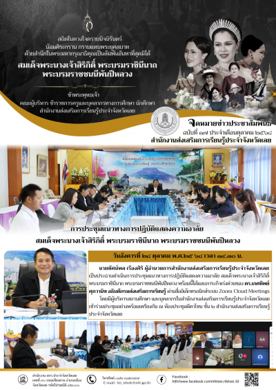 วันอังคารที่ ๒๘ ตุลาคม พ.ศ.๒๕ ๖๘ เวลา ๑๔.๓๐ น. นายทัศน์พล เรืองศิริ ผู้อำนวยการสำนักงานส่งเสริมการเรียนรู้ประจำจังหวัดเลย เป็นประธานดำเนินการประชุมแนวทางการปฏิบัติแสดงความอาลัย สมเด็จพระนางเจ้าสิริกิติ์ พระบรมราชินีนาถ พระบรมราชชนนีพันปีหลวง พร้อมนี้ได้มอบภาระกิจเร่งด่วนของ ดร.เกศทิพย์ ศุภวานิช อธิบดีกรมส่งเสริมการเรียนรู้ ผ่านสื่ออิเล็กทรอนิกส์ระบบ Zoom Cloud Meetings