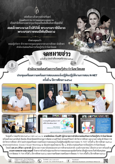 วันพุธที่ ๕ พฤศจิกายน ๒๕๖๘ เวลา ๐๙.๐๐ น. นายทัศน์พล เรืองศิริ ผู้อำนวยการสำนักงานส่งเสริมการเรียนรู้ประจำจังหวัดเลย พร้อมด้วยนางสายันต์ คิดเข่ม ศึกษานิเทศก์ชำนาญการพิเศษ นางสุรีวัลย์ พรหมศรีจันทร์ นักวิชาการศึกษา และนางสาวณัฐวดี คึมยะราช นักวิชาการศึกษา เข้าร่วมประชุมเตรียมความพร้อมการสอบและแจ้งปฏิทินปฏิบัติงานการสอบ N-NET ครั้งที่ ๒ ปีการศึกษา ๒๕๖๘ ผ่านระบบOnline Zoom Cloud Meeting ณ ห้องประชุมน้ำหมาน ชั้น ๑ สำนักงานส่งเสริมการเรียนรู้ประจำจังหวัดเลย
