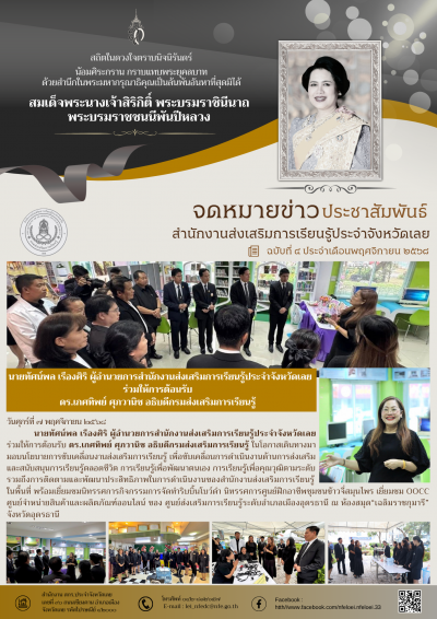 วันศุกร์ที่ ๗ พฤศจิกายน ๒๕๖๘ นายทัศน์พล เรืองศิริ ผู้อำนวยการสำนักงานส่งเสริมการเรียนรู้ประจำจังหวัดเลย ร่วมให้การต้อนรับ ดร.เกศทิพย์ ศุภวานิช อธิบดีกรมส่งเสริมการเรียนรู้ ในโอกาสเดินทางมามอบนโยบายการขับเคลื่อนงานส่งเสริมการเรียนรู้ เพื่อขับเคลื่อนการดำเนินงานด้านการส่งเสริมและสนับสนุนการเรียนรู้ตลอดชีวิต การเรียนรู้เพื่อพัฒนาตนเอง การเรียนรู้เพื่อคุณวุฒิตามระดับ รวมถึงการติดตามและพัฒนาประสิทธิภาพในการดำเนินงานของสำนักงานส่งเสริมการเรียนรู้ในพื้นที่ พร้อมเยี่ยมชมนิทรรศการกิจกรรมการจัดทำริบบิ้นโบว์ดำ นิทรรศการศูนย์ฝึกอาชีพชุมชนข้าวจี่สมุนไพร เยี่ยมชม OOCC ศูนย์จำหน่ายสินค้าและผลิตภัณฑ์ออนไลน์ ของ ศูนย์ส่งเสริมการเรียนรู้ระดับอำเภอเมืองอุดรธานี ณ ห้องสมุด“เฉลิมราชกุมารี”จังหวัดอุดรธานี