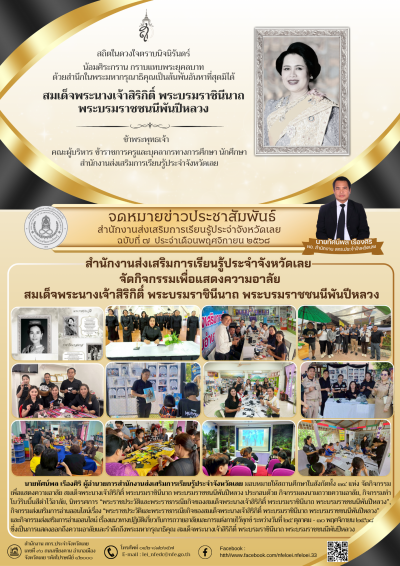 นายทัศน์พล เรืองศิริ ผู้อำนวยการสำนักงานส่งเสริมการเรียนรู้ประจำจังหวัดเลย มอบหมายให้สถานศึกษาในสังกัดทั้ง ๑๔ แห่ง จัดกิจกรรม เพื่อแสดงความอาลัย สมเด็จพระนางเจ้าสิริกิติ์ พระบรมราชินีนาถ พระบรมราชชนนีพันปีหลวง ประกอบด้วย กิจกรรมลงนามถวายความอาลัย, กิจกรรมทำโบว์ริบบิ้นสีดำไว้อาลัย, นิทรรศการ “พระราชประวัติและพระราชกรณียกิจของสมเด็จพระนางเจ้าสิริกิติ์ พระบรมราชินีนาถ พระบรมราชชนนีพันปีหลวง”,กิจกรรมส่งเสริมการอ่านออนไลน์เรื่อง “พระราชประวัติและพระราชกรณียกิจของสมเด็จพระนางเจ้าสิริกิติ์ พระบรมราชินีนาถ พระบรมราชชนนีพันปีหลวง” และกิจกรรมส่งเสริมการอ่านออนไลน์ เรื่องแนวทางปฏิบัติเกี่ยวกับการถวายอาลัยและการแต่งกายไว้ทุกข์ ระหว่างวันที่ ๒๕ ตุลาคม - ๑๐ พฤศจิกายน ๒๕๖๘ ซึ่งเป็นการแสดงออกถึงความอาลัยและรำลึกถึงพระมหากรุณาธิคุณ สมเด็จพระนางเจ้าสิริกิติ์ พระบรมราชินีนาถ พระบรมราชชนนีพันปีหลวง