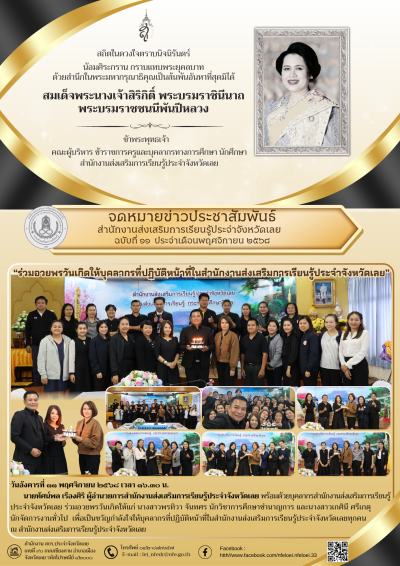 วันอังคารที่ ๑๑ พฤศจิกายน ๒๕๖๘ เวลา ๑๖.๓๐ น. นายทัศน์พล เรืองศิริ ผู้อำนวยการสำนักงานส่งเสริมการเรียนรู้ประจำจังหวัดเลย พร้อมด้วยบุคลากรสำนักงานส่งเสริมการเรียนรู้ประจำจังหวัดเลย ร่วมอวยพรวันเกิดให้แก่ นางสาวพรทิวา จันทศร นักวิชาการศึกษาชำนาญการ และนางสาวเกศินี ศรีเกตุ นักจัดการงานทั่วไป เพื่อเป็นขวัญกำลังใจให้บุคลากรที่ปฏิบัติหน้าที่ในสำนักงานส่งเสริมการเรียนรู้ประจำจังหวัดเลยทุกคน ณ สำนักงานส่งเสริมการเรียนรู้ประจำจังหวัดเลย