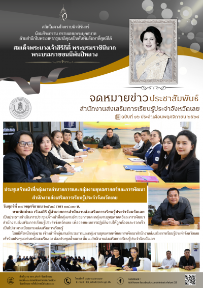 วันศุกร์ที่ ๑๔ พฤศจิกายน ๒๕๖๘ เวลา ๑๔.๐๐ น. นายทัศน์พล เรืองศิริ ผู้อำนวยการสำนักงานส่งเสริมการเรียนรู้ประจำจังหวัดเลย เป็นประธานดำเนินการประชุมเจ้าหน้าที่กลุ่มงานอำนวยการและกลุ่มงานยุทธศาสตร์และการพัฒนา สำนักงานส่งเสริมการเรียนรู้ประจำจังหวัดเลย เพื่อวางแผนการปฏิบัติงานให้ถูกต้องและรวดเร็วเป็นไปตามระเบียบกรมส่งเสริมการเรียนรู้