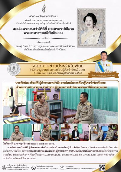 วันจันทร์ที่ ๑๗ พฤศจิกายน ๒๕๖๘ เวลา ๑๐.๐๐ น. นายทัศน์พล เรืองศิริ ผู้อำนวยการสำนักงานส่งเสริมการเรียนรู้ประจำจังหวัดเลย พร้อมด้วยนายธวัชชัย มันหาท้าว นักจัดการงานทั่วไป เข้าพบ นางสาวสายชล ตันอำนวย ผู้อำนวยการสำนักงานพัฒนาฝีมือแรงงานเลย เพื่อปรึกษาหารือตามนโยบายกรมส่งเสริมการเรียนรู้ โครงการ Zero Dropout, Learn to Earn และ Credit Bank (ธนาคารหน่วยกิต) ณ สำนักงานพัฒนาฝีมือแรงงานเลย