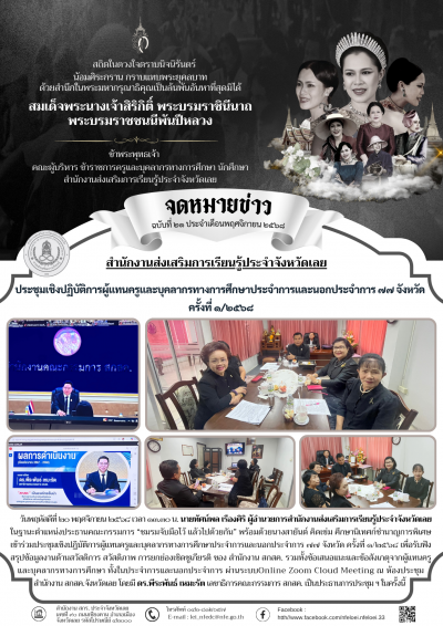วันพฤหัสดีที่ ๒๐ พฤศจิกายน ๒๕๖๘ เวลา ๑๓.๓๐ น. นายทัศน์พล เรืองศิริ ผู้อำนวยการสำนักงานส่งเสริมการเรียนรู้ประจำจังหวัดเลย ในฐานะตำแหน่งประธานคณะกรรมการ “ชมรมจับมือไว้ แล้วไปด้วยกัน” พร้อมด้วยนางสายันต์ คิดเข่ม ศึกษานิเทศก์ชำนาญการพิเศษ เข้าร่วมประชุมเชิงปฏิบัติการผู้แทนครูและบุคลากรทางการศึกษาประจำการและนอกประจำการ ๗๗ จังหวัด ครั้งที่ ๑/๒๕๖๘ เพื่อรับฟังสรุปข้อมูลงานด้านสวัสดิการ สวัสดิภาพ การยกย่องเชิดชูเกียรติ ของ สำนักงาน สกสค. รวมทั้งข้อเสนอแนะและข้อสังเกตุจากผู้แทนครูและบุคลากรทางการศึกษา ทั้งในประจำการและนอกประจำการ ผ่านระบบOnline Zoom Cloud Meeting ณ ห้องประชุมสำนักงาน สกสค.จังหวัดเลย โดยมี ดร.พีระพันธ์ เหมะรัต เลขาธิการคณะกรรมการ สกสค. เป็นประธานการประชุม ฯ ในครั้งนี้