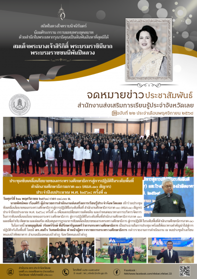 วันศุกร์ที่ ๒๑ พฤศจิกายน ๒๕๖๘ เวลา ๐๘.๐๐ น. นายทัศน์พล เรืองศิริ ผู้อำนวยการสำนักงานส่งเสริมการเรียนรู้ประจำจังหวัดเลย เข้าร่วมประชุมขับเคลื่อนโยบายของกระทรวงศึกษาธิการสู่การปฏิบัติในระดับพื้นที่ สำนักงานศึกษาธิการภาค ๑๐ (ศธภ.๑๐ สัญจร) ประจำปีงบประมาณ พ.ศ. ๒๕๖๘ ครั้งที่ ๑ เพื่อแลกเปลี่ยนความคิดเห็น และกำหนดแนวทางการบริหารจัดการในการขับเคลื่อนนโยบายของกระทรวงศึกษาธิการ สู่การปฏิบัติในระดับพื้นที่สำนักงานศึกษาธิการภาค ๑๐ และเพื่อกำกับ ติดตาม และส่งเสริม สนับสนุนการบูรณาการขับเคลื่อนโยบายของกระทระทรวงศึกษาธิการ สู่การปฏิบัติ ในระดับพื้นที่สำนักงานศึกษาธิการภาค ๑๐