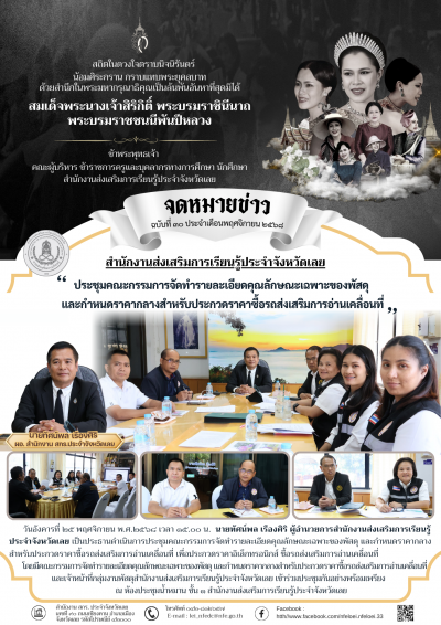 วันอังคารที่ ๒๕ พฤศจิกายน พ.ศ.๒๕๖๘ เวลา ๑๕.๐๐ น. นายทัศน์พล เรืองศิริ ผู้อำนวยการสำนักงานส่งเสริมการเรียนรู้ประจำจังหวัดเลย เป็นประธานดำเนินการประชุมคณะกรรมการจัดทำรายละเอียดคุณลักษณะเฉพาะของพัสดุ และกำหนดราคากลางสำหรับประกวดราคาซื้อรถส่งเสริมการอ่านเคลื่อนที่ เพื่อประกวดราคาอิเล็กทรอนิกส์ ซื้อรถส่งเสริมการอ่านเคลื่อนที่