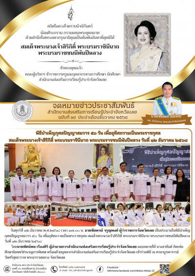 วันศุกร์ที่ ๑๒ ธันวาคม พ.ศ.๒๕๖๘ เวลา ๑๗.๐๐ น. นายชัยพจน์ จรูญพงศ์ ผู้ว่าราชการจังหวัดเลย เป็นประธานในพิธีบำเพ็ญกุศลปัญญาสมวาร ๕๐ วัน เพื่ออุทิศถวายเป็นพระราชกุศล สมเด็จพระนางเจ้าสิริกิติ์ พระบรมราชินีนาถ พระบรมราชชนนีพันปีหลวง วันที่ ๑๒ ธันวาคม ๒๕๖๘