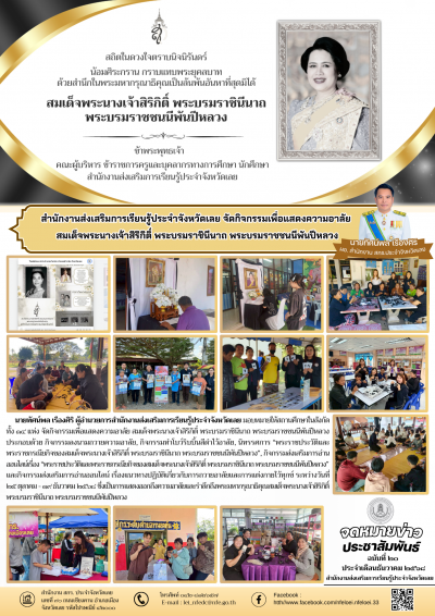 นายทัศน์พล เรืองศิริ ผู้อำนวยการสำนักงานส่งเสริมการเรียนรู้ประจำจังหวัดเลย มอบหมายให้สถานศึกษาในสังกัด ทั้ง ๑๔ แห่ง จัดกิจกรรมเพื่อแสดงความอาลัย สมเด็จพระนางเจ้าสิริกิติ์ พระบรมราชินีนาถ พระบรมราชชนนีพันปีหลวง ประกอบด้วย กิจกรรมลงนามถวายความอาลัย, กิจกรรมทำโบว์ริบบิ้นสีดำไว้อาลัย, นิทรรศการ “พระราชประวัติและพระราชกรณียกิจของสมเด็จพระนางเจ้าสิริกิติ์ พระบรมราชินีนาถ พระบรมราชชนนีพันปีหลวง”, กิจกรรมส่งเสริมการอ่านออนไลน์เรื่อง “พระราชประวัติและพระราชกรณียกิจของสมเด็จพระนางเจ้าสิริกิติ์ พระบรมราชินีนาถ พระบรมราชชนนีพันปีหลวง” และกิจกรรมส่งเสริมการอ่านออนไลน์ เรื่องแนวทางปฏิบัติเกี่ยวกับการถวายอาลัยและการแต่งกายไว้ทุกข์ ระหว่างวันที่ ๒๕ ตุลาคม - ๑๙ ธันวาคม ๒๕๖๘ ซึ่งเป็นการแสดงออกถึงความอาลัยและรำลึกถึงพระมหากรุณาธิคุณสมเด็จพระนางเจ้าสิริกิติ์ พระบรมราชินีนาถ พระบรมราชชนนีพันปีหลวง