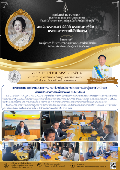 วันที่ ๒๓ ธันวาคม พ.ศ.๒๕๖๘ เวลา ๐๙.๓๐ น. นายทัศน์พล เรืองศิริ ผู้อำนวยการสำนักงานส่งเสริมการเรียนรู้ประจำจังหวัดเลย เข้าร่วมพิจารณาผลการประกวดราคาซื้อรถส่งเสริมการอ่านเคลื่อนที่ สำนักงานส่งเสริมการเรียนรู้ประจำจังหวัดเลย ด้วยวิธีประกวดราคาอิเล็กทรอนิกส์ (e-bidding) เพื่อประกวดราคาซื้อรถส่งเสริมการเรียนรู้เคลื่อนที่ ให้มีความเหมาะสมสำหรับจัดกิจกรรมส่งเสริมการอ่านเคลื่อนที่ให้แก่ประชาชนทุกช่วงวัย