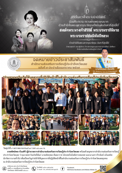 วันศุกร์ที่ ๙ มกราคม พ.ศ.๒๕๖๙ เวลา ๑๖.๓๐ น. นายทัศน์พล เรืองศิริ ผู้อำนวยการสำนักงานส่งเสริมการเรียนรู้ประจำจังหวัดเลย พร้อมด้วยบุคลากรสำนักงานส่งเสริมการเรียนรู้ประจำจังหวัดเลย ร่วมอวยพรวันเกิดให้แก่ นายลัทธพล คึมยะราช นักเทคโนโลยีสารสนเทศ และนางสาวจีรนันท์ มโนสถิต นักจัดการงานทั่วไป เพื่อเป็นขวัญกำลังใจให้บุคลากรที่ปฏิบัติหน้าที่ในสำนักงานส่งเสริมการเรียนรู้ประจำจังหวัดเลยทุกคน ณ สำนักงานส่งเสริมการเรียนรู้ประจำจังหวัดเลย