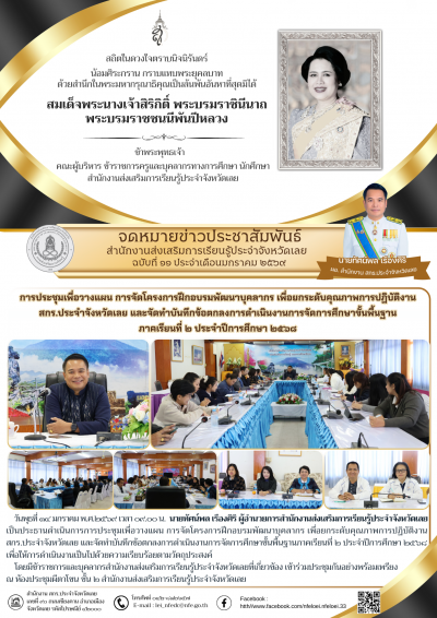 วันพุธที่ ๑๔ มกราคม พ.ศ.๒๕๖๙ เวลา ๐๙.๐๐ น. นายทัศน์พล เรืองศิริ ผู้อำนวยการสำนักงานส่งเสริมการเรียนรู้ประจำจังหวัดเลย เป็นประธานดำเนินการการประชุมเพื่อวางแผน การจัดโครงการฝึกอบรมพัฒนาบุคลากร เพื่อยกระดับคุณภาพการปฏิบัติงาน สกร.ประจำจังหวัดเลย และจัดทำบันทึกข้อตกลงการดำเนินงานการจัดการศึกษาขั้นพื้นฐานภาคเรียนที่ ๒ ประจำปีการศึกษา ๒๕๖๘ เพื่อให้การดำเนินงานเป็นไปด้วยความเรียบร้อยตามวัตถุประสงค์