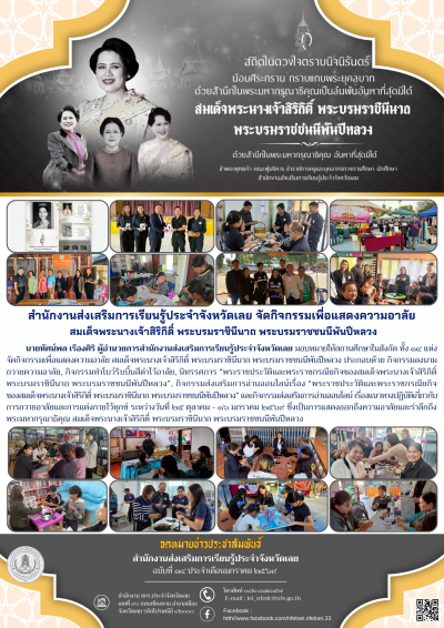 นายทัศน์พล เรืองศิริ ผู้อำนวยการสำนักงานส่งเสริมการเรียนรู้ประจำจังหวัดเลย มอบหมายให้สถานศึกษาในสังกัด ทั้ง ๑๔ แห่ง จัดกิจกรรมเพื่อแสดงความอาลัย สมเด็จพระนางเจ้าสิริกิติ์ พระบรมราชินีนาถ พระบรมราชชนนีพันปีหลวง ประกอบด้วย กิจกรรมลงนาม ถวายความอาลัย, กิจกรรมทำโบว์ริบบิ้นสีดำไว้อาลัย, นิทรรศการ “พระราชประวัติและพระราชกรณียกิจของสมเด็จพระนางเจ้าสิริกิติ์ พระบรมราชินีนาถ พระบรมราชชนนีพันปีหลวง”, กิจกรรมส่งเสริมการอ่านออนไลน์เรื่อง “พระราชประวัติและพระราชกรณียกิจ ของสมเด็จพระนางเจ้าสิริกิติ์ พระบรมราชินีนาถ พระบรมราชชนนีพันปีหลวง” และกิจกรรมส่งเสริมการอ่านออนไลน์ เรื่องแนวทางปฏิบัติเกี่ยวกับ การถวายอาลัยและการแต่งกายไว้ทุกข์ ระหว่างวันที่ ๒๕ ตุลาคม - ๑๖ มกราคม ๒๕๖๙ ซึ่งเป็นการแสดงออกถึงความอาลัยและรำลึกถึง พระมหากรุณาธิคุณ สมเด็จพระนางเจ้าสิริกิติ์ พระบรมราชินีนาถ พระบรมราชชนนีพันปีหลวง