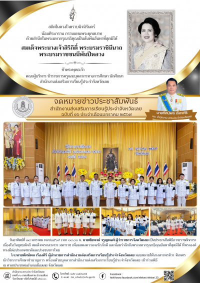 โดยนายทัศน์พล เรืองศิริ ผู้อำนวยการสำนักงานส่งเสริมการเรียนรู้ประจำจังหวัดเลย มอบหมายให้นางสาวพรทิวา จันทศร นักวิชาการศึกษาชำนาญการ พร้อมด้วยบุคลากรสำนักงานส่งเสริมการเรียนรู้ประจำจังหวัดเลย เข้าร่วมพิธี ณ ศาลาประชาคมอำเภอเมืองเลย จังหวัดเลย