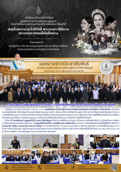 วันพุธที่ ๒๘ มกราคม พ.ศ.๒๕๖๙ เวลา ๐๙.๐๐ น. นายทัศน์พล เรืองศิริ ผู้อำนวยการสำนักงานส่งเสริมการเรียนรู้ประจำจังหวัดเลย พร้อมด้วยนางสายันต์ คิดเข่ม ศึกษานิเทศก์ชำนาญการพิเศษ และนางสาวพรทิวา จันทศร นักวิชาการศึกษาชำนาญการ เข้าร่วมการประชุมการจัดทำข้อเสนอการบริหารงานเชิงพื้นที่แบบบูรณาการด้านการศึกษาจังหวัดเลย เพื่อสื่อสารนโยบายและยุทธศาสตร์ของกระทรวงศึกษาธิการสู่การปฏิบัติให้สอดคล้องกับการพัฒนาจังหวัดเลย สู่การพัฒนาการศึกษาแบบบูรณาการกับหน่วยงานที่เกี่ยวข้องสังกัดกระทรวงศึกษาธิการในพื้นที่จังหวัดเลย