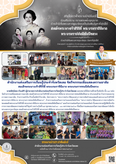 นายทัศน์พล เรืองศิริ ผู้อำนวยการสำนักงานส่งเสริมการเรียนรู้ประจำจังหวัดเลย มอบหมายให้สถานศึกษาในสังกัด ทั้ง ๑๔ แห่ง จัดกิจกรรมเพื่อแสดงความอาลัย สมเด็จพระนางเจ้าสิริกิติ์ พระบรมราชินีนาถ พระบรมราชชนนีพันปีหลวง ประกอบด้วย กิจกรรมลงนามถวายความอาลัย, กิจกรรมทำโบว์ริบบิ้นสีดำไว้อาลัย, นิทรรศการ “พระราชประวัติและพระราชกรณียกิจของสมเด็จพระนางเจ้าสิริกิติ์ พระบรมราชินีนาถ พระบรมราชชนนีพันปีหลวง”, กิจกรรมส่งเสริมการอ่านออนไลน์เรื่อง “พระราชประวัติและพระราชกรณียกิจของสมเด็จพระนางเจ้าสิริกิติ์ พระบรมราชินีนาถ พระบรมราชชนนีพันปีหลวง” และกิจกรรมส่งเสริมการอ่านออนไลน์ เรื่องแนวทางปฏิบัติเกี่ยวกับการถวายอาลัยและการแต่งกายไว้ทุกข์ ระหว่างวันที่ ๒๕ ตุลาคม ๒๕๖๘ - ๓๐ มกราคม ๒๕๖๙ ซึ่งเป็นการแสดงออกถึงความอาลัยและรำลึกถึง พระมหากรุณาธิคุณ สมเด็จพระนางเจ้าสิริกิติ์ พระบรมราชินีนาถ พระบรมราชชนนีพันปีหลวง