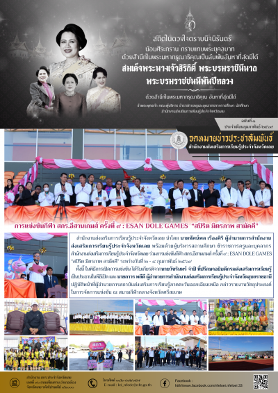 สำนักงานส่งเสริมการเรียนรู้ประจำจังหวัดเลย นำโดย นายทัศน์พล เรืองศิริ ผู้อำนวยการสำนักงานส่งเสริมการเรียนรู้ประจำจังหวัดเลย พร้อมด้วยผู้บริหารสถานศึกษา ข้าราชการครูและบุคลากรสำนักงานส่งเสริมการเรียนรู้ประจำจังหวัดเลย ร่วมการแข่งขันกีฬา สกร.อีสานเกมส์ ครั้งที่ ๙ : ESAN DOLE GAMES “สปิริต มิตรภาพ สามัคคี” ระหว่างวันที่ ๒ - ๔ กุมภาพันธ์ ๒๕๖๙