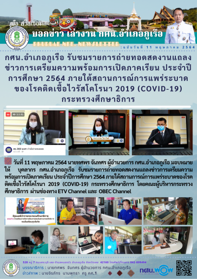 กศน.อำเภอภูเรือ รับชมรายการถ่ายทอดสดงานแถลงข่าวการเตรียมความพร้อมการเปิดภาคเรียน ประจำปีการศึกษา 2564 ภายใต้สถานการณ์การแพร่ระบาดของโรคติดเชื้อไวรัสโคโรนา 2019 (COVID-19) กระทรวงศึกษาธิการ